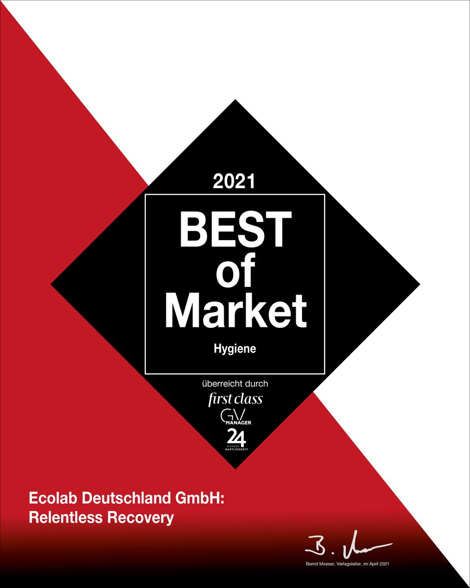 Der Hygiene-Experte Ecolab mit Firmensitz in Monheim am Rhein gewinnt im Rahmen der Fachmesse Internorga den Leserpreis BEST of Market 2021 in der Kategorie Hygiene. Der Preis basiert auf den Marktforschungs-Ergebnissen dreier deutscher Fachmagazine der Hotellerie, Gastronomie und Gemeinschaftsverpflegung über das Markt- und Einkaufsverhalten im gesamten Außer-Haus-Markt. Der vom Branchen-magazin Tophotel vergebene Preis Tophotel Star Award 2021, der in einer Leserwahl innovative Produkte und Leistungen der Hotelzulieferindustrie auszeichnet, ging ebenfalls an Ecolab: in Silber und in der Kategorie Prozessoptimierung.