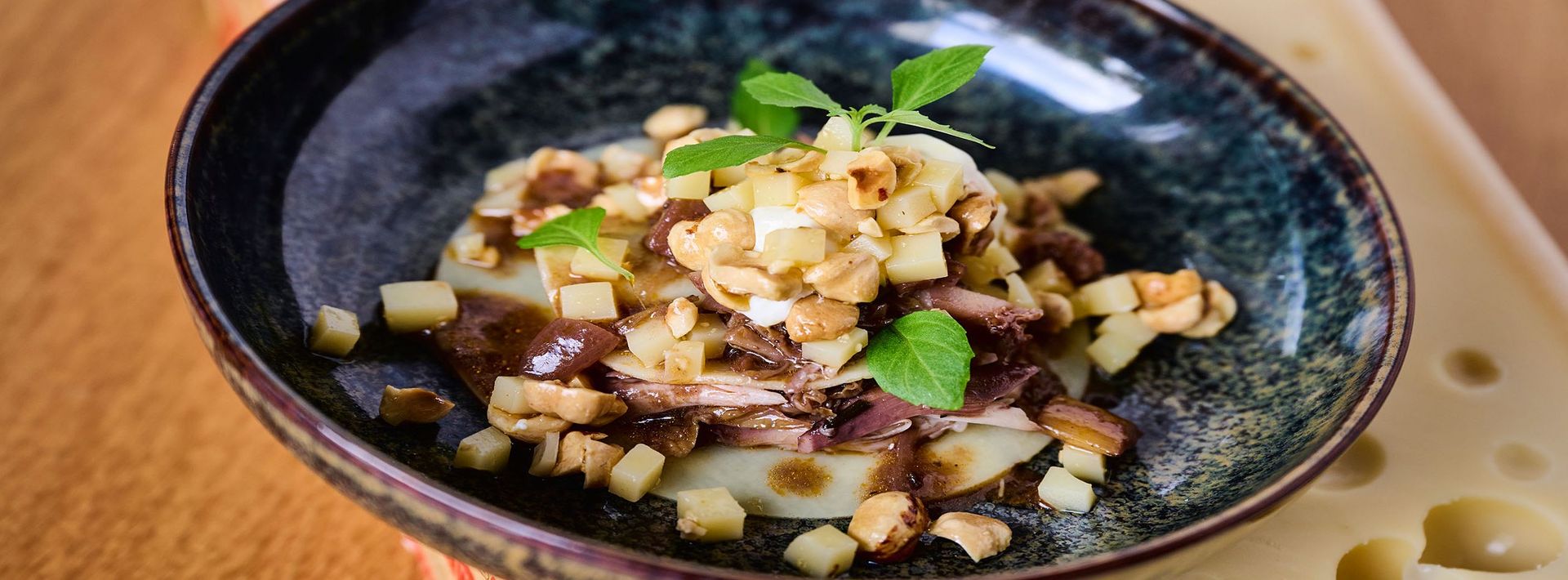 mit Emmentaler AOP und Surchoix-Haselnuss-Ragout. Ein Menü – kreiert von Spitzenkoch Ivo Adam