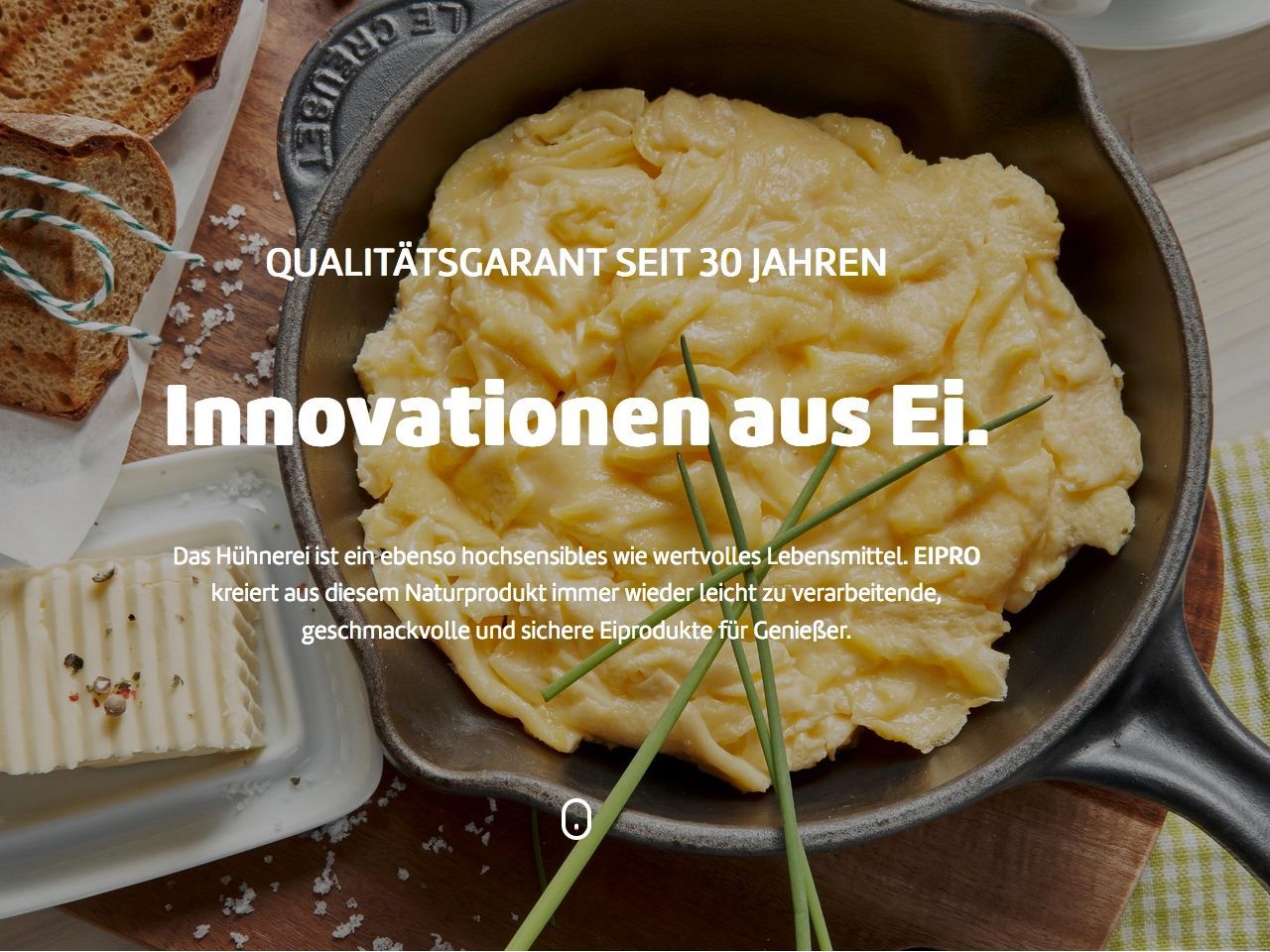 Unter www.eipro.de präsentiert sich der Qualitätsgarant für Innovationen aus Ei in einem ganz neuen Outfit. Eine klare, übersichtliche Struktur führt den interessierten Besucher direkt zu den gewünschten Informationen. Wer ein wenig links und rechts gucken möchte, scrollt die Seite herunter und erfährt interessante und neue Facts aus dem Hause EIPRO. Oder wussten Sie, dass EIPRO 200 Mitarbeiter beschäftigt? Und dass die Eiprodukte in 20 Ländern Europas erhältlich sind? Dass das Unternehmen mehrfach zertifiziert ist und der Unternehmensanspruch an die Qualität weit über das gesetzlich geforderte Maß hinaus geht?