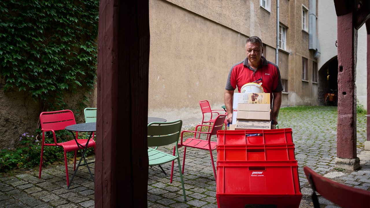 Pistor beliefert die «Tanne» maximal einmal pro Woche. Diese tiefe Frequenz wirkt sich positiv auf die Konditionen aus. Auch das höchstmögliche Lieferzeitfenster trägt dazu bei und dass Claudine-Sachi alles frühzeitig digital bestellt. «Zur Lieferung muss ich sagen: Das ist einfach fantastisch! Der Fahrer hat einen Schlüssel. Meistens kommt er, wenn niemand von uns da ist. Ich kann ihm voll vertrauen, dass einfach alles funktioniert. So wie heute mit Peter.» Meistens ist er es, der die «Tanne» beliefert. Für ihn ist die Lieferung nicht ganz ohne. Er parkt den Lkw auf einem grossen Platz rund hundert Meter vom Restaurant entfernt. Dort lädt er die Ware auf den Sackkarren um und schiebt sie durch die Gassen in den Hinterhof der «Tanne», wo sich die Vorratskammer befindet.