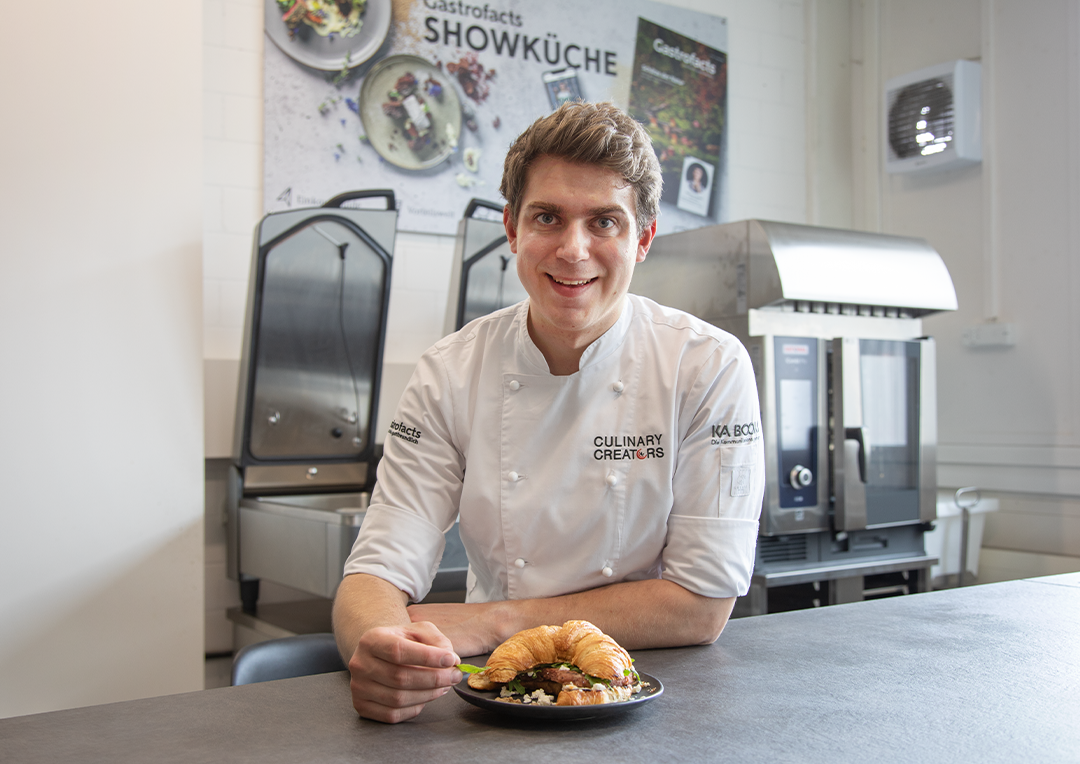 Roman Wohler, Teammitglied der Culinary Creators – der exklusiven Kochcrew von Gastrofacts – und Chefkoch der EFA, zeigt in der Gastrofacts-Kochshow zum Foodtrend Hybrid Food, wie die kreative Fusion klassischer Gerichte zu überraschenden neuen Geschmackserlebnissen führt.