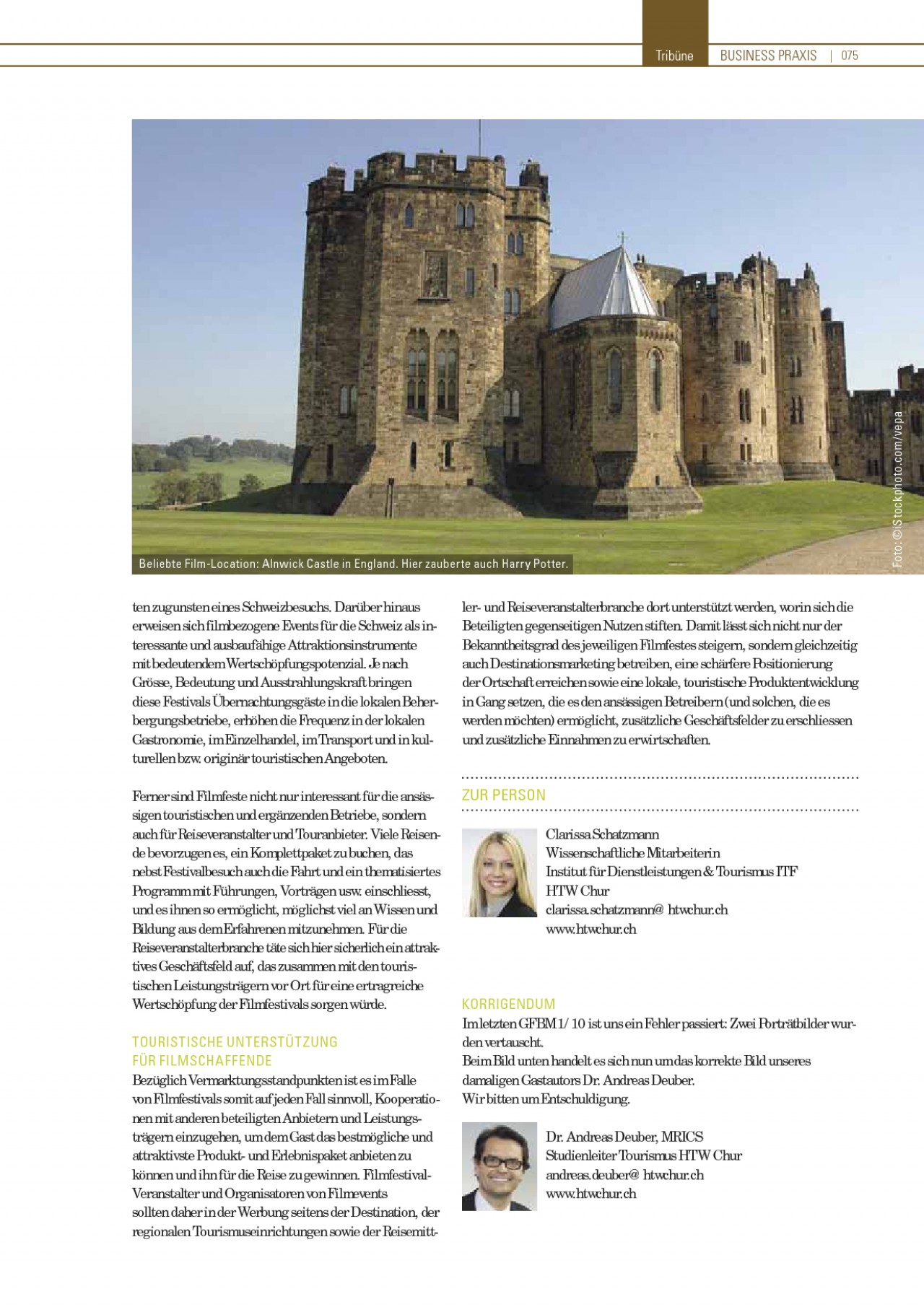 INHALT: Tribüne BUSINESS PRAXIS | 075 Beliebte Film-Location: Alnwick Castle in England. Hier zauberte auch Harry Potter. ten zugunsten eines Schweizbesuchs. Darüber hinaus erweisen sich filmbezogene Events für die Schweiz als interessante und ausbaufähige Attraktionsinstrumente mit bedeutendem Wertschöpfungspotenzial. Je nach Grösse, Bedeutung und Ausstrahlungskraft bringen diese Festivals Übernachtungsgäste in die lokalen Beherbergungsbetriebe, erhöhen die Frequenz in der lokalen Gastronomie, im Einzelhandel, im Transport und in kulturellen bzw. originär touristischen Angeboten. Ferner sind Filmfeste nicht nur interessant für die ansässigen touristischen und ergänzenden Betriebe, sondern auch für Reiseveranstalter und Touranbieter. Viele Reisende bevorzugen es, ein Komplettpaket zu buchen, das nebst Festivalbesuch auch die Fahrt und ein thematisiertes Programm mit Führungen, Vorträgen usw. einschliesst, und es ihnen so ermöglicht, möglichst viel an Wissen und Bildung aus dem Erfahrenen mitzunehmen. Für die Reiseveranstalterbranche täte sich hier sicherlich ein attraktives Geschäftsfeld auf, das zusammen mit den touristischen Leistungsträgern vor Ort für eine ertragreiche Wertschöpfung der Filmfestivals sorgen würde. TOURISTISCHE UNTERSTÜTZUNG FÜR FILMSCHAFFENDE Bezüglich Vermarktungsstandpunkten ist es im Falle von Filmfestivals somit auf jeden Fall sinnvoll, Kooperatio nen mit anderen beteiligten Anbietern und Leistungsträgern einzugehen, um dem Gast das bestmögliche und attraktivste Produkt- und Erlebnispaket anbieten zu können und ihn für die Reise zu gewinnen. FilmfestivalVeranstalter und Organisatoren von Filmevents sollten daher in der Werbung seitens der Destination, der regionalen Tourismuseinrichtungen sowie der Reisemitt- ler- und Reiseveranstalterbranche dort unterstützt werden, worin sich die Beteiligten gegenseitigen Nutzen stiften. Damit lässt sich nicht nur der Bekanntheitsgrad des jeweiligen Filmfestes steigern, sondern gleichzeitig auch Destinationsmarketing betreiben, eine schärfere Positionierung der Ortschaft erreichen sowie eine lokale, touristische Produktentwicklung in Gang setzen, die es den ansässigen Betreibern (und solchen, die es werden möchten) ermöglicht, zusätzliche Geschäftsfelder zu erschliessen und zusätzliche Einnahmen zu erwirtschaften. ZUR PERSON Clarissa Schatzmann Wissenschaftliche Mitarbeiterin Institut für Dienstleistungen & Tourismus ITF HTW Chur clarissa.schatzmann@htwchur.ch www.htwchur.ch KORRIGENDUM Im letzten GFBM 1/10 ist uns ein Fehler passiert: Zwei Porträtbilder wurden vertauscht. Beim Bild unten handelt es sich nun um das korrekte Bild unseres damaligen Gastautors Dr. Andreas Deuber. Wir bitten um Entschuldigung. Dr. Andreas Deuber, MRICS Studienleiter Tourismus HTW Chur andreas.deuber@htwchur.ch www.htwchur.ch Foto: ©iStockphoto.com/vepa