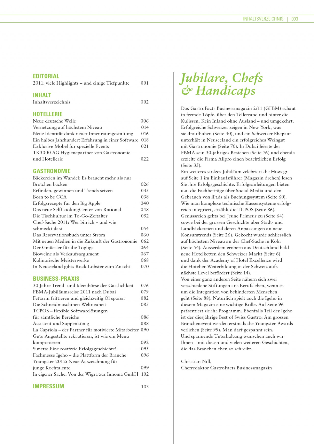 INHALT: PUBLIREPORTAGE INHALTSVERZEICHNIS | 003 EDITORIAL 2011: viele Highlights und einige Tiefpunkte 001 INHALT Inhaltsverzeichnis 002 Jubilare, Chefs & Handicaps Das GastroFacts Businessmagazin 2/11 (GFBM) schaut in fremde Töpfe, über den Tellerrand und hinter die Kulissen. Kein Inland ohne Ausland und umgekehrt. Erfolgreiche Schweizer zeigen in New York, was sie draufhaben (Seite 40), und ein Schweizer Ehepaar unterhält in Neuseeland ein erfolgreiches Weingut mit Gastronomie (Seite 70). In Dubai feierte der FBMA sein 30-jähriges Bestehen (Seite 76) und ebenda erzielte die Firma Alipro einen beachtlichen Erfolg (Seite 35). Ein weiteres stolzes Jubiläum zelebriert die Howeg: auf Seite 1 im Einkaufsführer (Magazin drehen) lesen Sie ihre Erfolgsgeschichte. Erfolgsanleitungen bieten u.a. die Fachbeiträge über Social Media und den Gebrauch von iPads als Buchungssystem (Seite 60). Wie man komplexe technische Kassensysteme erfolgreich integriert, erzählt die TCPOS (Seite 86). Genussreich gehts bei Jeune Primeur zu (Seite 64) sowie bei der grossen Geschichte über Stadt- und Landbäckereien und deren Anpassungen an neue Konsumtrends (Seite 26). Gekocht wurde schliesslich auf höchstem Niveau an der Chef-Sache in Köln (Seite 54). Ausserdem erobern aus Deutschland bald neue Hotelketten den Schweizer Markt (Seite 6) und dank der Academy of Hotel Excellence wird die Hotelier-Weiterbildung in der Schweiz aufs nächste Level befördert (Seite 14). Von einer ganz anderen Seite nähern sich zwei verschiedene Stiftungen ans Berufsleben, wenn es um die Integration von behinderten Menschen geht (Seite 88). Natürlich spielt auch die Igeho in diesem Magazin eine wichtige Rolle. Auf Seite 96 präsentiert sie ihr Programm. Ebenfalls Teil der Igeho ist der diesjährige Best of Swiss Gastro: Am grossen Branchenevent werden erstmals die Youngster-Awards verliehen (Seite 99). Man darf gespannt sein. Und spannende Unterhaltung wünschen auch wir Ihnen mit diesen und vielen weiteren Geschichten, die das Branchenleben so schreibt. Christian Nill, Chefredaktor GastroFacts Businessmagazin HOTELLERIE Neue deutsche Welle Vernetzung auf höchstem Niveau Neue Identität dank neuer Innenraumgestaltung Ein halbes Jahrhundert Erfahrung in einer Software Exklusive Möbel für spezielle Events TK3000 AG Hygienepartner von Gastronomie und Hotellerie 006 014 016 018 021 022 GASTRONOMIE Bäckereien im Wandel: Es braucht mehr als nur Brötchen backen Erfinden, gewinnen und Trends setzen Born to be CCA Erfolgsrezepte für den Big Apple Das neue SelfCookingCenter von Rational Die Tischkultur im To-Go-Zeitalter Chef-Sache 2011: Wer bin ich und wie schmeckt das? Das Reservationsbuch unter Strom Mit neuen Medien in die Zukunft der Gastronomie Der Gmüesler für die Topliga Bioweine als Verkaufsargument Kulinarische Meisterwerke In Neuseeland gibts Rock-Lobster zum Znacht 026 035 038 040 048 052 054 060 062 064 067 068 070 BUSINESS-PRAXIS 30 Jahre Trend- und Ideenbörse der Gastlichkeit FBMA-Jubiläumsreise 2011 nach Dubai Fettarm frittieren und gleichzeitig Öl sparen Die Schneidmaschinen-Weltneuheit TCPOS flexible Softwarelösungen für sämtliche Bereiche Assistent und Suppenkönig La Capriola der Partner für motivierte Mitarbeiter Gute Angestellte rekrutieren, ist wie ein Menü komponieren Simeta: Eine rostfreie Erfolgsgeschichte! Fachmesse Igeho die Plattform der Branche Youngster 2012: Neue Auszeichnung für junge Kochtalente In eigener Sache: Von der Wigra zur Innoma GmbH 076 079 082 085 086 088 090 092 095 096 099 102 103 IMPRESSUM