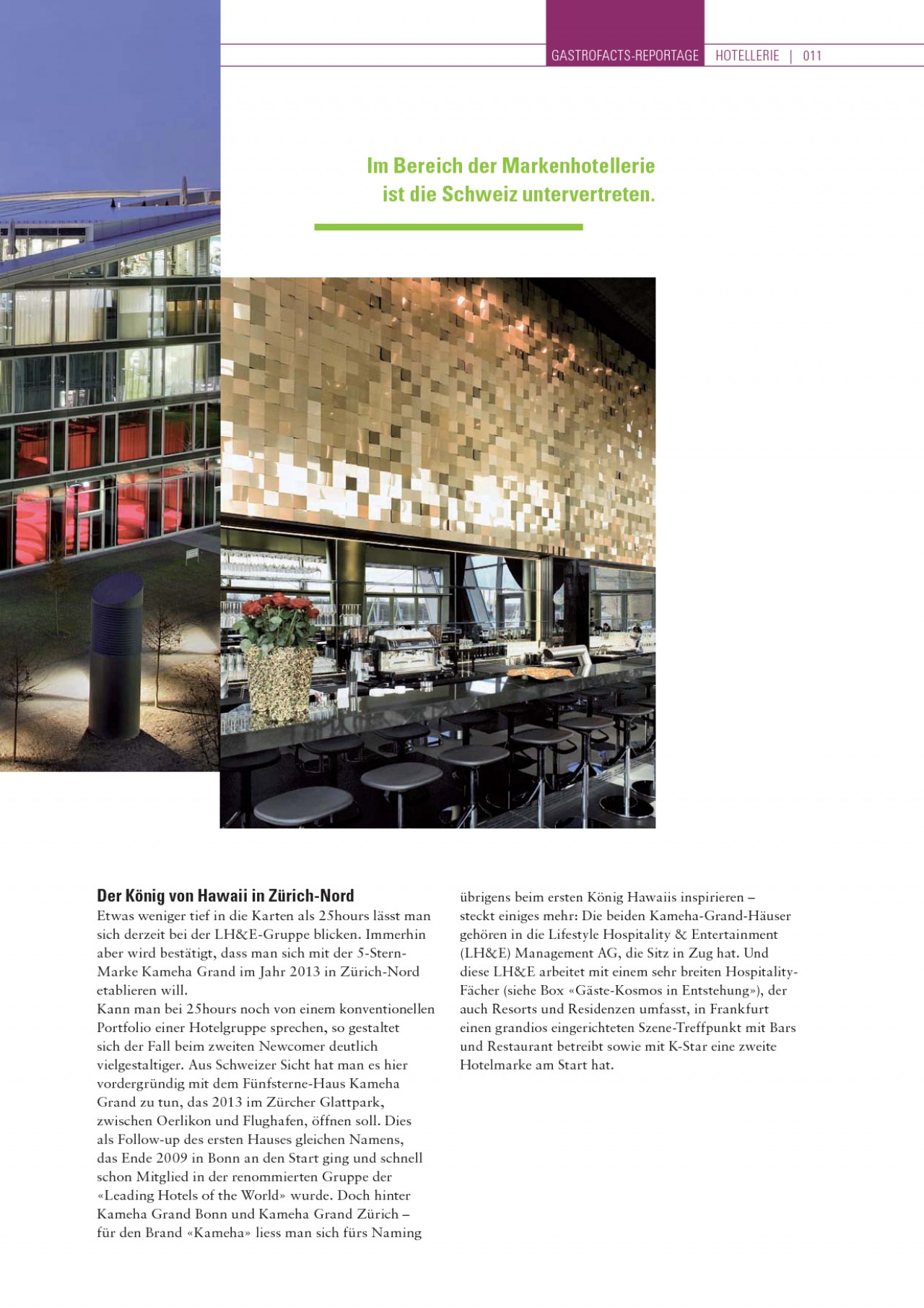 INHALT: GASTROFACTS-REPORTAGE HOTELLERIE | 011 Im Bereich der Markenhotellerie ist die Schweiz untervertreten. Der König von Hawaii in Zürich-Nord Etwas weniger tief in die Karten als 25hours lässt man sich derzeit bei der LH&E-Gruppe blicken. Immerhin aber wird bestätigt, dass man sich mit der 5-SternMarke Kameha Grand im Jahr 2013 in Zürich-Nord etablieren will. Kann man bei 25hours noch von einem konventionellen Portfolio einer Hotelgruppe sprechen, so gestaltet sich der Fall beim zweiten Newcomer deutlich vielgestaltiger. Aus Schweizer Sicht hat man es hier vordergründig mit dem Fünfsterne-Haus Kameha Grand zu tun, das 2013 im Zürcher Glattpark, zwischen Oerlikon und Flughafen, öffnen soll. Dies als Follow-up des ersten Hauses gleichen Namens, das Ende 2009 in Bonn an den Start ging und schnell schon Mitglied in der renommierten Gruppe der «Leading Hotels of the World» wurde. Doch hinter Kameha Grand Bonn und Kameha Grand Zürich für den Brand «Kameha» liess man sich fürs Naming übrigens beim ersten König Hawaiis inspirieren steckt einiges mehr: Die beiden Kameha-Grand-Häuser gehören in die Lifestyle Hospitality & Entertainment (LH&E) Management AG, die Sitz in Zug hat. Und diese LH&E arbeitet mit einem sehr breiten HospitalityFächer (siehe Box «Gäste-Kosmos in Entstehung»), der auch Resorts und Residenzen umfasst, in Frankfurt einen grandios eingerichteten Szene-Treffpunkt mit Bars und Restaurant betreibt sowie mit K-Star eine zweite Hotelmarke am Start hat.