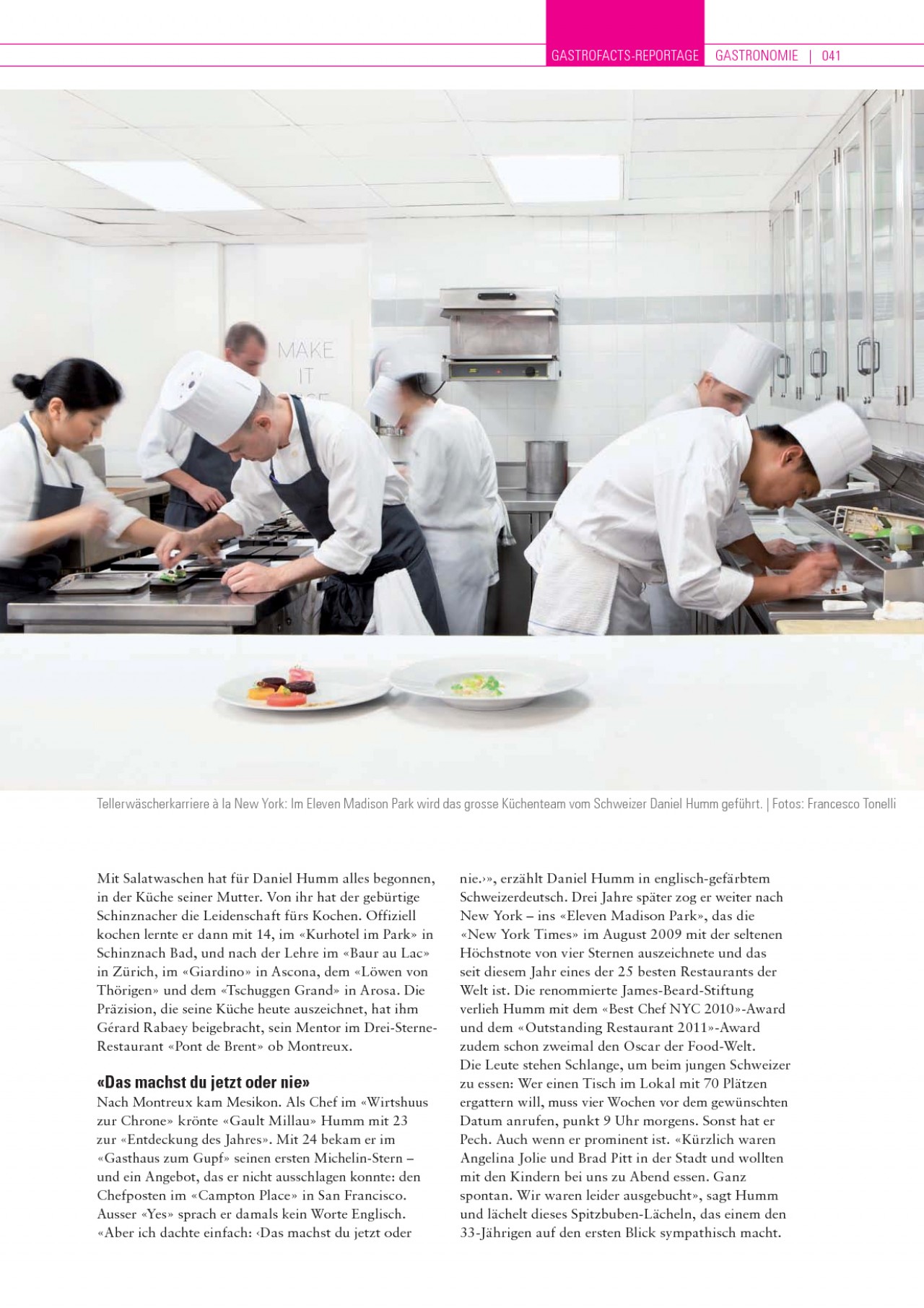 INHALT: GASTROFACTS-REPORTAGE GASTRONOMIE | 041 Tellerwäscherkarriere à la New York: Im Eleven Madison Park wird das grosse Küchenteam vom Schweizer Daniel Humm geführt. | Fotos: Francesco Tonelli Mit Salatwaschen hat für Daniel Humm alles begonnen, in der Küche seiner Mutter. Von ihr hat der gebürtige Schinznacher die Leidenschaft fürs Kochen. Offiziell kochen lernte er dann mit 14, im «Kurhotel im Park» in Schinznach Bad, und nach der Lehre im «Baur au Lac» in Zürich, im «Giardino» in Ascona, dem «Löwen von Thörigen» und dem «Tschuggen Grand» in Arosa. Die Präzision, die seine Küche heute auszeichnet, hat ihm Gérard Rabaey beigebracht, sein Mentor im Drei-SterneRestaurant «Pont de Brent» ob Montreux. «Das machst du jetzt oder nie» Nach Montreux kam Mesikon. Als Chef im «Wirtshuus zur Chrone» krönte «Gault Millau» Humm mit 23 zur «Entdeckung des Jahres». Mit 24 bekam er im «Gasthaus zum Gupf» seinen ersten Michelin-Stern und ein Angebot, das er nicht ausschlagen konnte: den Chefposten im «Campton Place» in San Francisco. Ausser «Yes» sprach er damals kein Worte Englisch. «Aber ich dachte einfach: », erzählt Daniel Humm in englisch-gefärbtem Schweizerdeutsch. Drei Jahre später zog er weiter nach New York ins «Eleven Madison Park», das die «New York Times» im August 2009 mit der seltenen Höchstnote von vier Sternen auszeichnete und das seit diesem Jahr eines der 25 besten Restaurants der Welt ist. Die renommierte James-Beard-Stiftung verlieh Humm mit dem «Best Chef NYC 2010»-Award und dem «Outstanding Restaurant 2011»-Award zudem schon zweimal den Oscar der Food-Welt. Die Leute stehen Schlange, um beim jungen Schweizer zu essen: Wer einen Tisch im Lokal mit 70 Plätzen ergattern will, muss vier Wochen vor dem gewünschten Datum anrufen, punkt 9 Uhr morgens. Sonst hat er Pech. Auch wenn er prominent ist. «Kürzlich waren Angelina Jolie und Brad Pitt in der Stadt und wollten mit den Kindern bei uns zu Abend essen. Ganz spontan. Wir waren leider ausgebucht», sagt Humm und lächelt dieses Spitzbuben-Lächeln, das einem den 33-Jährigen auf den ersten Blick sympathisch macht.