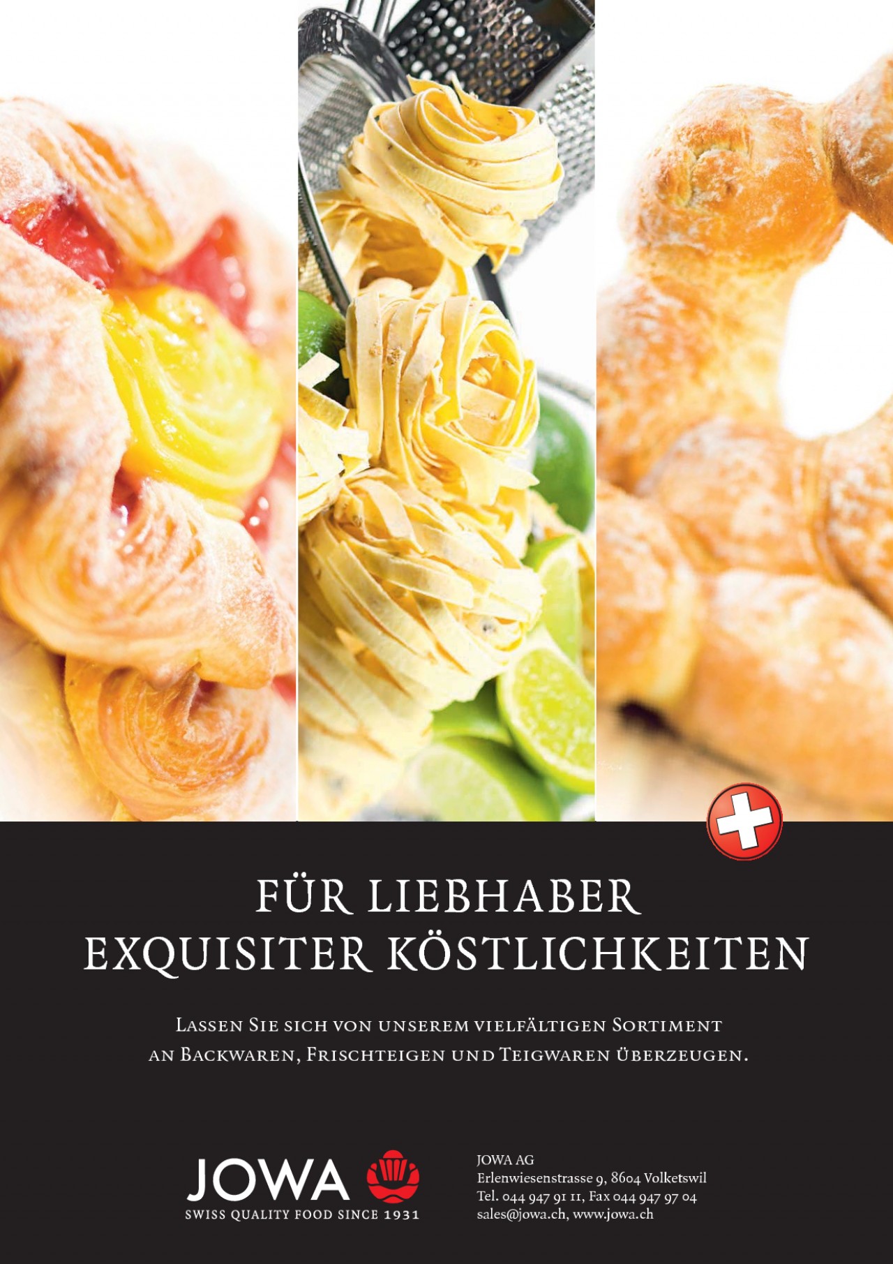PUBLIREPORTAGE GASTRONOMIE | 051 FÜR LIEBHABER EXQUISITER KÖSTLICHKEITEN Lassen Sie sich von unserem vielfältigen Sortiment an Backwaren, Frischteigen und Teigwaren überzeugen. JOWA AG Erlenwiesenstrasse 9, 8604 Volketswil Tel. 044 947 91 11, Fax 044 947 97 04 sales@jowa.ch, www.jowa.ch