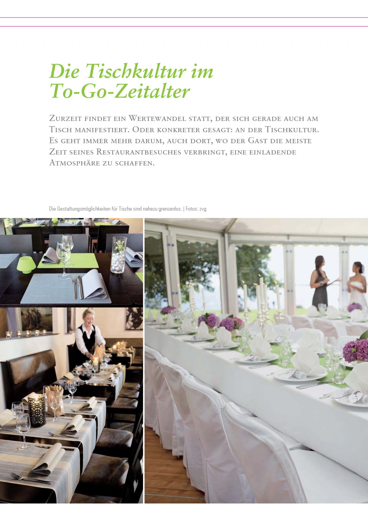 Die Tischkultur im To-Go-Zeitalter Zurzeit findet ein Wertewandel statt, der sich gerade auch am Tisch manifestiert. Oder konkreter gesagt: an der Tischkultur. Es geht immer mehr darum, auch dort, wo der Gast die meiste Zeit seines Restaurantbesuches verbringt, eine einladende Atmosphäre zu schaffen. Die Gestaltungsmöglichkeiten für Tische sind nahezu grenzenlos. | Fotos: zvg