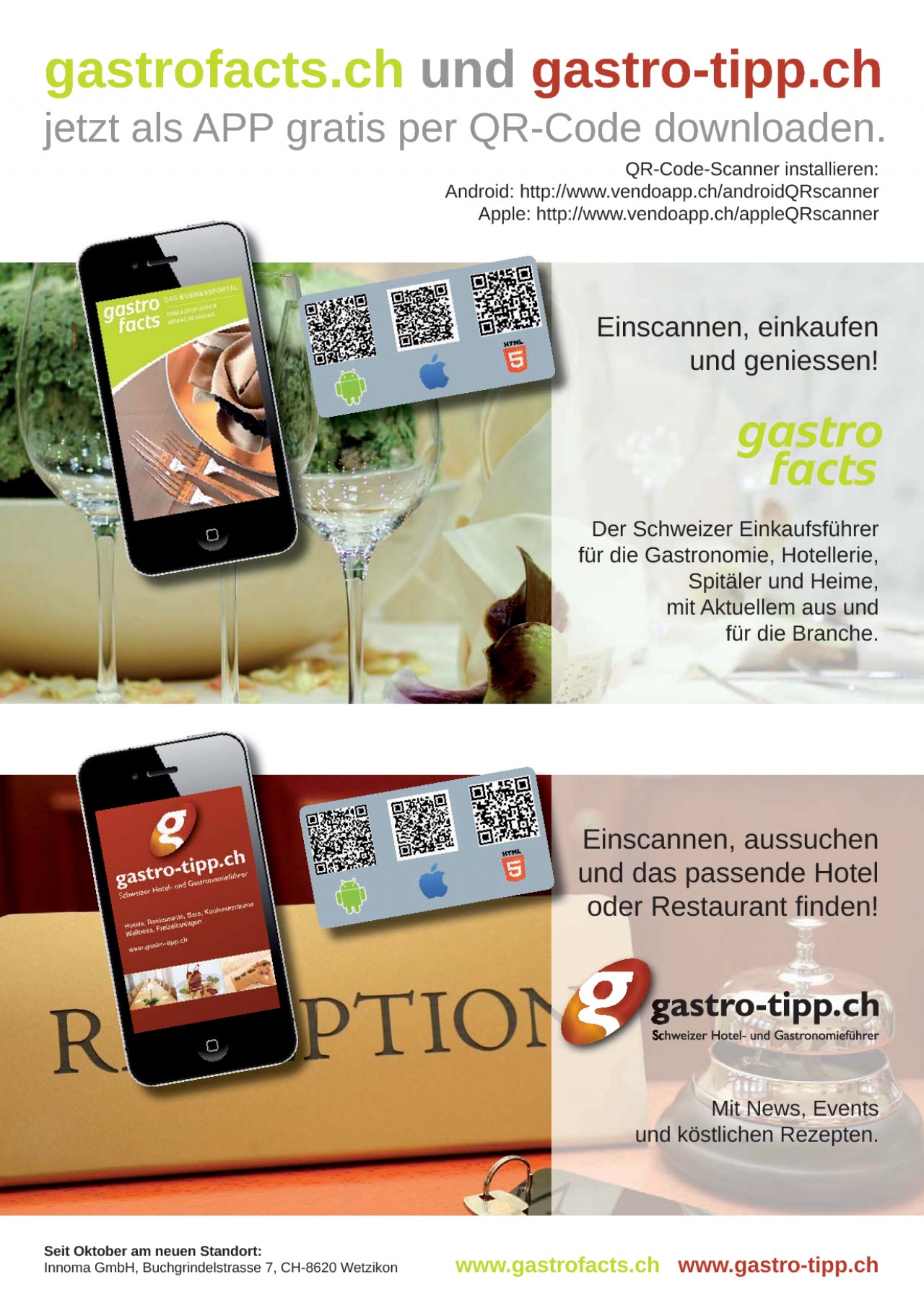 INHALT: JDVWURIDFWVFK XQG JDVWURWLSSFK 45&RGH6FDQQHU LQVWDOOLHUHQ $QGURLG KWWSZZZYHQGRDSSFKDQGURLG45VFDQQHU $SSOH KWWSZZZYHQGRDSSFKDSSOH45VFDQQHU MHW]W DOV $33 JUDWLV SHU 45&RGH GRZQORDGHQ (LQVFDQQHQ HLQNDXIHQ XQG JHQLHVVHQ 'HU 6FKZHL]HU (LQNDXIVIKUHU IU GLH *DVWURQRPLH +RWHOOHULH 6SLWlOHU XQG +HLPH PLW $NWXHOOHP DXV XQG IU GLH %UDQFKH (LQVFDQQHQ DXVVXFKHQ XQG GDV SDVVHQGH +RWHO RGHU 5HVWDXUDQW ¾QGHQ 0LW 1HZV (YHQWV XQG N|VWOLFKHQ 5H]HSWHQ 6HLW 2NWREHU DP QHXHQ 6WDQGRUW ,QQRPD *PE+ %XFKJULQGHOVWUDVVH &+ :HW]LNRQ ZZZJDVWURIDFWVFK ZZZJDVWURWLSSFK