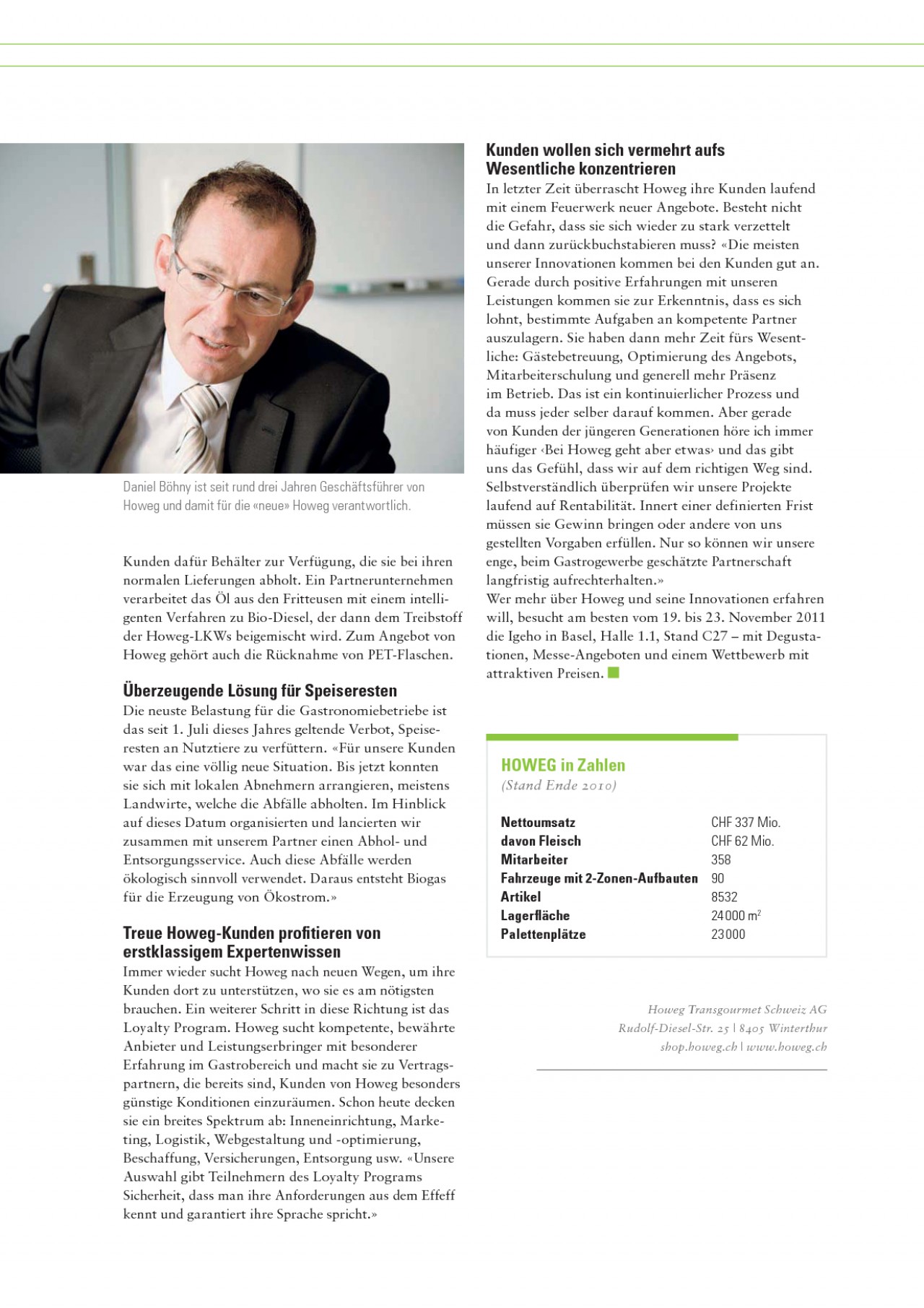 INHALT: Willkommene Unterstützung bei der Abfallentsorgung In diesem Sinn unterstützt Howeg ihre Kunden mehr und mehr bei der Entsorgung ihrer Abfälle. Seit einigen Jahren läuft das Speiseöl-Recycling. Howeg stellt ihren Kunden wollen sich vermehrt aufs Wesentliche konzentrieren In letzter Zeit überrascht Howeg ihre Kunden laufend mit einem Feuerwerk neuer Angebote. Besteht nicht die Gefahr, dass sie sich wieder zu stark verzettelt und dann zurückbuchstabieren muss? «Die meisten unserer Innovationen kommen bei den Kunden gut an. Gerade durch positive Erfahrungen mit unseren Leistungen kommen sie zur Erkenntnis, dass es sich lohnt, bestimmte Aufgaben an kompetente Partner auszulagern. Sie haben dann mehr Zeit fürs Wesentliche: Gästebetreuung, Optimierung des Angebots, Mitarbeiterschulung und generell mehr Präsenz im Betrieb. Das ist ein kontinuierlicher Prozess und da muss jeder selber darauf kommen. Aber gerade von Kunden der jüngeren Generationen höre ich immer häufiger und das gibt uns das Gefühl, dass wir auf dem richtigen Weg sind. Selbstverständlich überprüfen wir unsere Projekte laufend auf Rentabilität. Innert einer definierten Frist müssen sie Gewinn bringen oder andere von uns gestellten Vorgaben erfüllen. Nur so können wir unsere enge, beim Gastrogewerbe geschätzte Partnerschaft langfristig aufrechterhalten.» Wer mehr über Howeg und seine Innovationen erfahren will, besucht am besten vom 19. bis 23. November 2011 die Igeho in Basel, Halle 1.1, Stand C27 mit Degustationen, Messe-Angeboten und einem Wettbewerb mit attraktiven Preisen. Daniel Böhny ist seit rund drei Jahren Geschäftsführer von Howeg und damit für die «neue» Howeg verantwortlich. Kunden dafür Behälter zur Verfügung, die sie bei ihren normalen Lieferungen abholt. Ein Partnerunternehmen verarbeitet das Öl aus den Fritteusen mit einem intelligenten Verfahren zu Bio-Diesel, der dann dem Treibstoff der Howeg-LKWs beigemischt wird. Zum Angebot von Howeg gehört auch die Rücknahme von PET-Flaschen. Überzeugende Lösung für Speiseresten Die neuste Belastung für die Gastronomiebetriebe ist das seit 1. Juli dieses Jahres geltende Verbot, Speiseresten an Nutztiere zu verfüttern. «Für unsere Kunden war das eine völlig neue Situation. Bis jetzt konnten sie sich mit lokalen Abnehmern arrangieren, meistens Landwirte, welche die Abfälle abholten. Im Hinblick auf dieses Datum organisierten und lancierten wir zusammen mit unserem Partner einen Abhol- und Entsorgungsservice. Auch diese Abfälle werden ökologisch sinnvoll verwendet. Daraus entsteht Biogas für die Erzeugung von Ökostrom.» HOWEG in Zahlen (Stand Ende 2010) Nettoumsatz davon Fleisch Mitarbeiter Fahrzeuge mit 2-Zonen-Aufbauten Artikel Lagerfläche Palettenplätze CHF 337 Mio. CHF 62 Mio. 358 90 8532 24 000 m2 23 000 Treue Howeg-Kunden profitieren von erstklassigem Expertenwissen Immer wieder sucht Howeg nach neuen Wegen, um ihre Kunden dort zu unterstützen, wo sie es am nötigsten brauchen. Ein weiterer Schritt in diese Richtung ist das Loyalty Program. Howeg sucht kompetente, bewährte Anbieter und Leistungserbringer mit besonderer Erfahrung im Gastrobereich und macht sie zu Vertragspartnern, die bereits sind, Kunden von Howeg besonders günstige Konditionen einzu räumen. Schon heute decken sie ein breites Spektrum ab: Inneneinrichtung, Marketing, Logistik, Webgestaltung und -optimierung, Beschaffung, Versicherungen, Entsorgung usw. «Unsere Auswahl gibt Teilnehmern des Loyalty Programs Sicherheit, dass man ihre Anforderungen aus dem Effeff kennt und garantiert ihre Sprache spricht.» Howeg Transgourmet Schweiz AG Rudolf-Diesel-Str. 25 | 8405 Winterthur shop.howeg.ch | www.howeg.ch