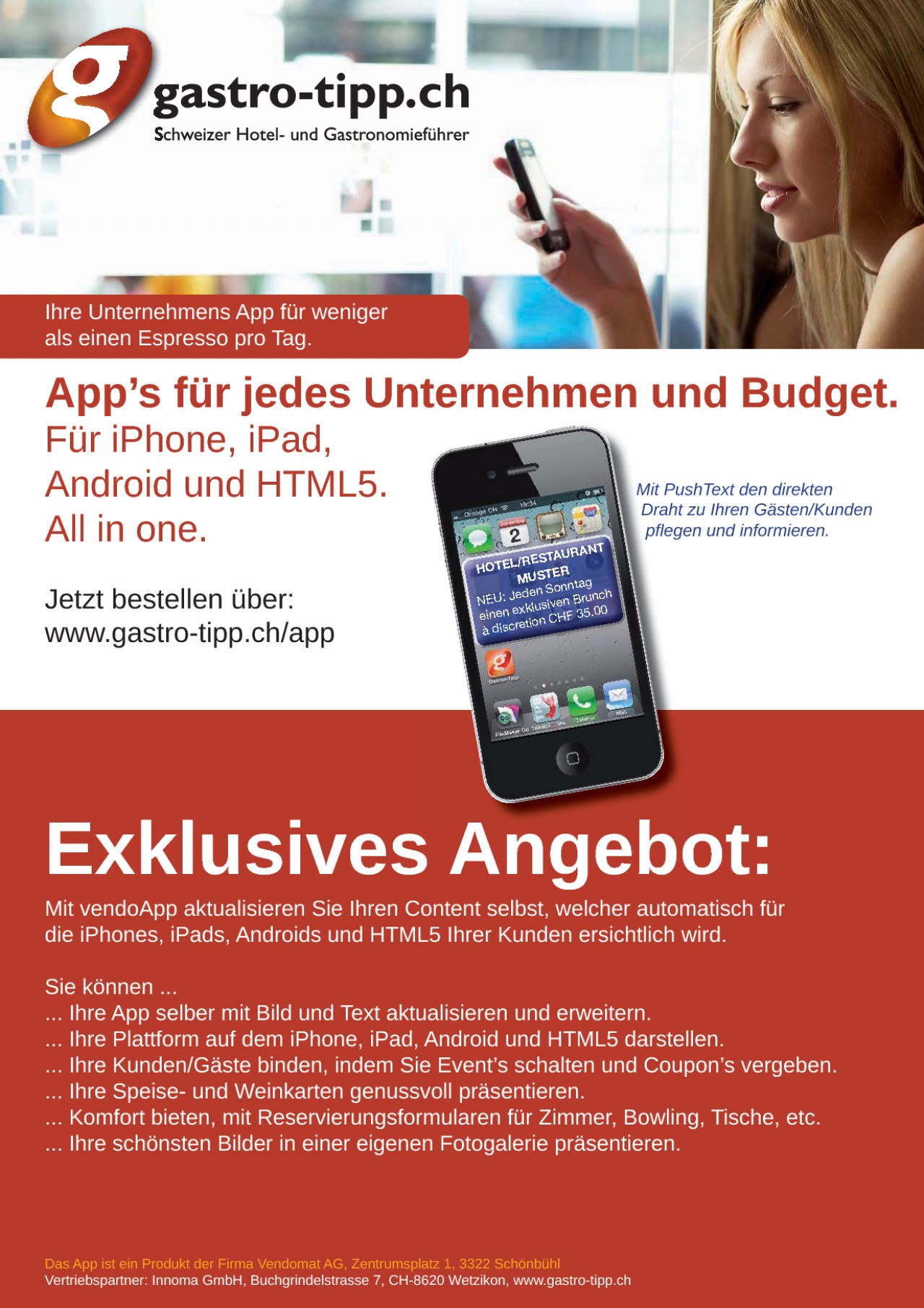 INHALT: PUBLIREPORTAGE | 007 ,KUH 8QWHUQHKPHQV $SS IU ZHQLJHU DOV HLQHQ (VSUHVVR SUR 7DJ $SSµV IU MHGHV 8QWHUQHKPHQ XQG %XGJHW )U L3KRQH L3DG $QGURLG XQG +70/ $OO LQ RQH -HW]W EHVWHOOHQ EHU ZZZJDVWURWLSSFKDSS 0LW 3XVK7H[W GHQ GLUHNWHQ 'UDKW ]X ,KUHQ *lVWHQ.XQGHQ S¿HJHQ XQG LQIRUPLHUHQ RANT ESTAU TEL/R HO ER MUST ntag en Son runch ed NEU: J lusiven B xk 0 einen e on CHF 35.0 discreti à ([NOXVLYHV $QJHERW 0LW YHQGR$SS DNWXDOLVLHUHQ 6LH ,KUHQ &RQWHQW VHOEVW ZHOFKHU DXWRPDWLVFK IU GLH L3KRQHV L3DGV $QGURLGV XQG +70/ ,KUHU .XQGHQ HUVLFKWOLFK ZLUG 6LH N|QQHQ ,KUH $SS VHOEHU PLW %LOG XQG 7H[W DNWXDOLVLHUHQ XQG HUZHLWHUQ ,KUH 3ODWWIRUP DXI GHP L3KRQH L3DG $QGURLG XQG +70/ GDUVWHOOHQ ,KUH .XQGHQ*lVWH ELQGHQ LQGHP 6LH (YHQWµV VFKDOWHQ XQG &RXSRQµV YHUJHEHQ ,KUH 6SHLVH XQG :HLQNDUWHQ JHQXVVYROO SUlVHQWLHUHQ .RPIRUW ELHWHQ PLW 5HVHUYLHUXQJVIRUPXODUHQ IU =LPPHU %RZOLQJ 7LVFKH HWF ,KUH VFK|QVWHQ %LOGHU LQ HLQHU HLJHQHQ )RWRJDOHULH SUlVHQWLHUHQ 'DV $SS LVW HLQ 3URGXNW GHU )LUPD 9HQGRPDW $* =HQWUXPVSODW] 6FK|QEKO 9HUWULHEVSDUWQHU ,QQRPD *PE+ %XFKJULQGHOVWUDVVH &+ :HW]LNRQ ZZZJDVWURWLSSFK