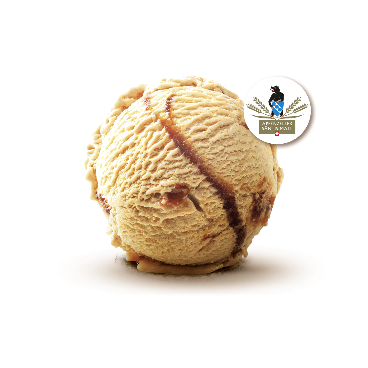 Feine Rahmglace mit eingestrudelter Whiskysauce aus echtem Säntis Single Malt Whisky aus Appenzell. Die Brauerei Locher (1886) stellt den Single Malt mit Gerste von den höchstgelegenten Anbaugebieten der Schweiz her.