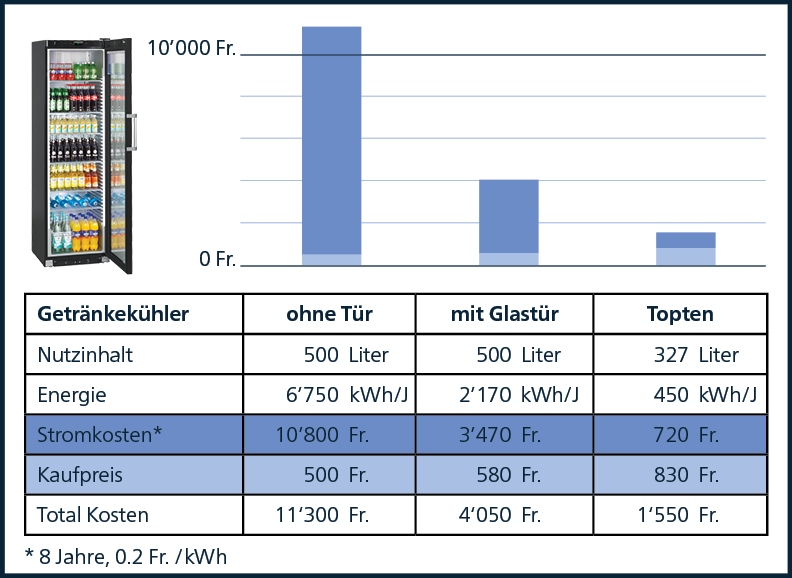 Der Stromverbrauch zum Kühlen ist eindrücklich: Rund 50 % des Energieverbrauchs gehen zum Beispiel in Supermärkten auf das Konto von Gefrier- und Kühlgeräten. Hier kann durch den Kauf energieeffizienter Geräte einfache Abhilfe geschaffen werden. Und dazu profitiert man erst noch von attraktiven Förderbeiträgen. Die Technologie für gewerbliche Kühlgeräte hat sich in den vergangenen Jahren erheblich verbessert, dies ist unter anderem der 2016 eingeführten europäischen Energieetikette für Lager- und Gastronomie-Kühlgeräte zu verdanken. Die «Bestprodukte» verbesserten sich dadurch in nur einem Jahr um bis zu 30 Prozent. Für Betreiber hat dies erhebliche Auswirkungen: Mit einem effizienten Lager-Kühlgerät können im Vergleich zu einem Altgerät bis zu 80 % Energie eingespart werden.