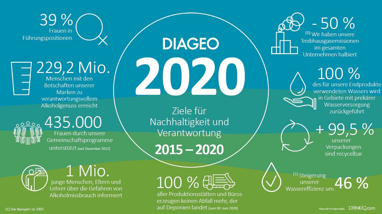 Die Ziele für 2020 wurden so ausgewählt, dass sie mit den UN-Zielen für nachhaltige Entwicklung übereinstimmen und die drei Hauptschwerpunkte von DIAGEO abdecken: Verringerung der Umweltbelastung, Aufbau florierender Gemeinschaften und die Förderung eines verantwortungsvollen Umgangs mit Alkohol. Zu den Highlights gehören: