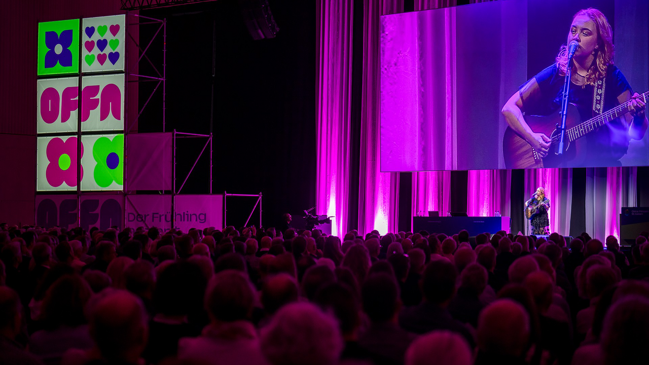 Direkt vor der Generalversammlung erlebten die Aktionärinnen und Aktionäre eine poetische Eröffnung der 48. OFFA. Ein dramatisches Frühlingserwachen auf grossen Leinwänden liess die Halle aus der Dunkelheit ins Licht bringen. Intensive Farben, florale Bilder und kraftvolle visuelle Effekte standen sinnbildlich für Aufbruch und Erneuerung. Begleitet wurde die Inszenierung von der St.Galler Musikerin Joya Marleen, die dieser Frühlingsgeschichte mit ihrer Stimme eine besondere Tiefe verlieh. Gleichzeitig präsentierte sich die OFFA erstmals im neuen visuellen Auftritt und machte spürbar, wofür die OFFA seit jeher steht: Für den Frühlingsanfang, fröhliche Begegnungen und die Freude am gemeinsamen Erlebnis.