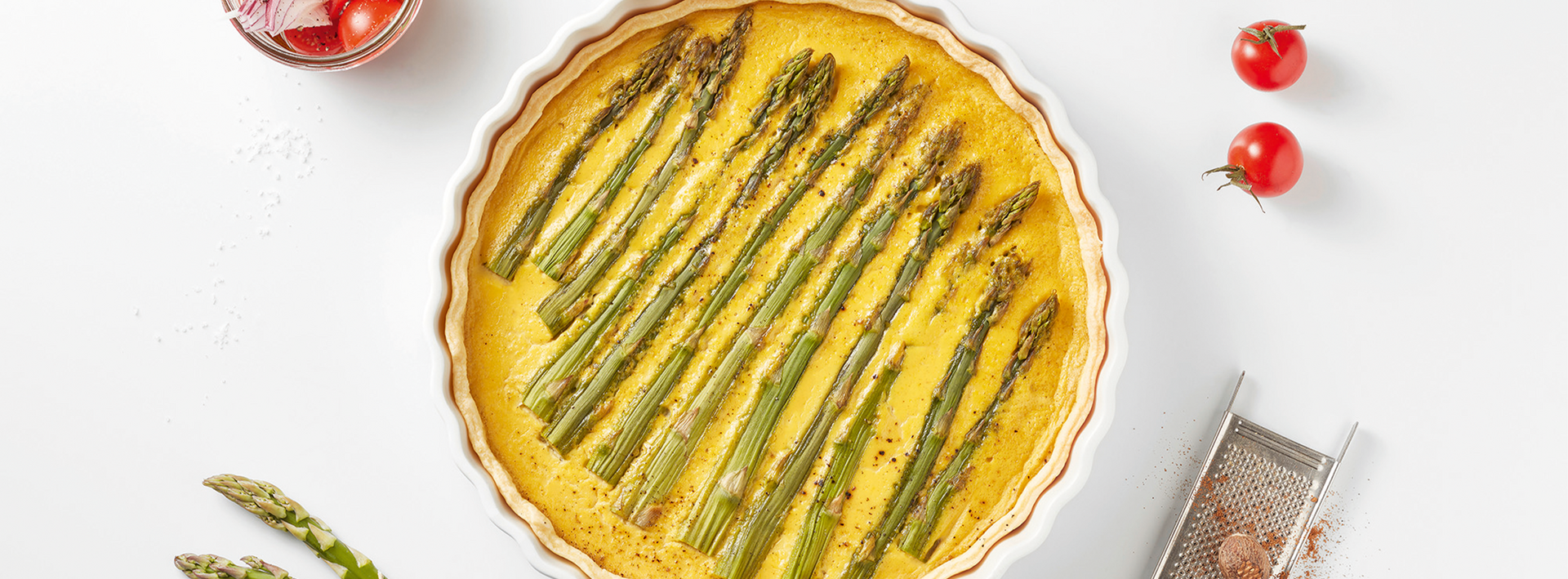 Die Spargelfüllung auf den Teig geben, mit Spargelstangen dekorieren und die Quiche backen: