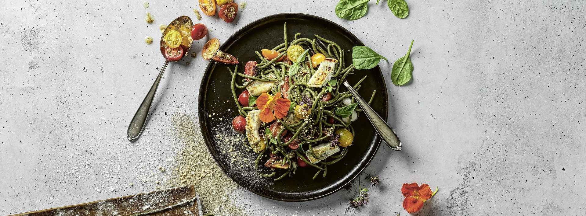 Zander in Streifen schneiden, in wenig Rapsöl sautieren, mit Salz und Pfeffer würzen, herausnehmen. Knoblauch und Zwiebeln fein schneiden und in Butter andünsten. Cherrytomaten halbieren und mitdunsten, würzen und Basilikum-Julienne beigeben. Die abgekochte Pasta und den sautierten Zander dazugeben, schwenken und abschmecken. Vor dem Servieren mit frischem Basilikum, Blüten und gepufftem Quinoa garnieren.