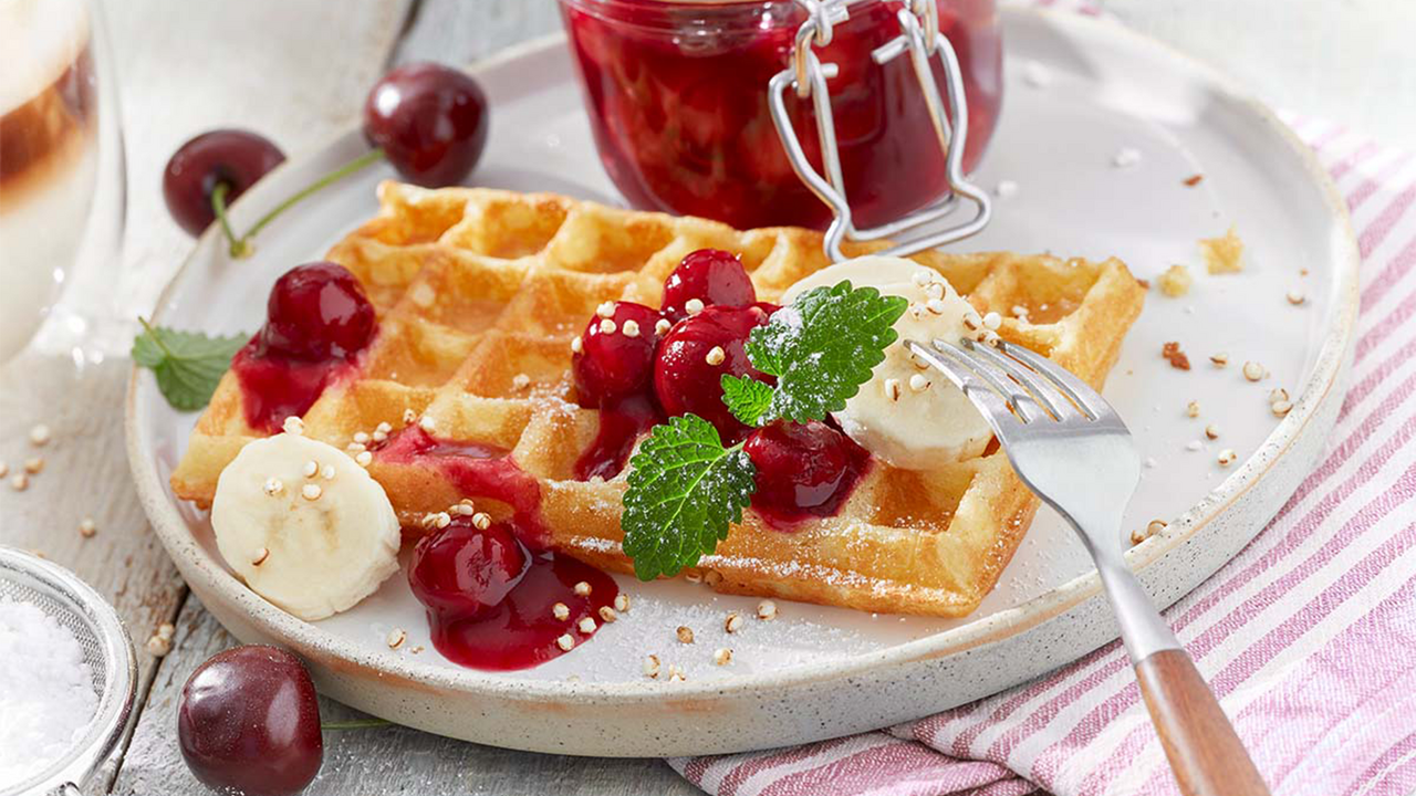 ca. 80 ml Eifix frischen Waffelteig in das heiße, gefettete Waffeleisen gießen und backen. Mit Sylter Kirschgrütze und Sahne auf einem Teller anrichten und servieren.