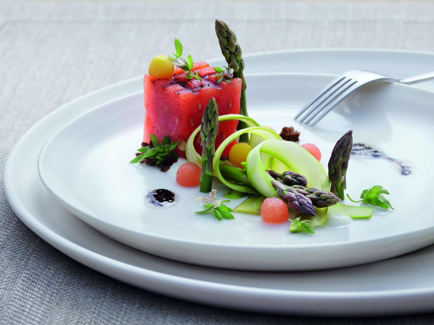 Spargel verfügt über ein klar definiertes aber nicht zu dominantes Eigenaroma. Weshalb er sich wunderbar kombinieren lässt mit fruchtigen Nuancen. Frühsommerliche Freudensprünge machen Herz und Gaumen bei Spargelsalat mit Wassermelone. Perfekt mariniert wird mit Bärlauch-Öl und Tomaten-Essig, im Dressing sorgt Salat Universal für köstlichen Geschmack und die richtige Bindung.