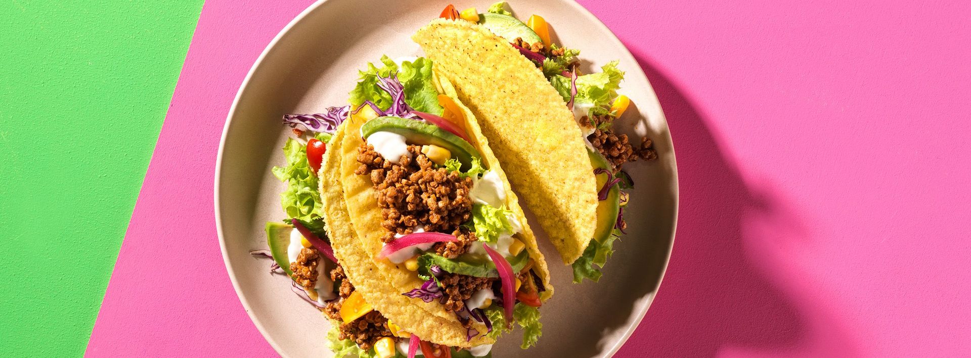 Taco Shells im Ofen erwärmen und mit Zutaten nach Wahl befüllen.